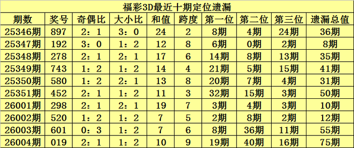 发布日期:2026-01-06 08:25 点击次数:100开奖回首:福彩3D第2026004期奖号:019,百位号码遗漏19期、十位号码遗漏40期、个位号码遗漏16期,遗漏总值为75期。